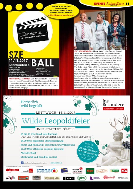 JAHNTURNHALLE ST. PÖLTEN: „SZE-Ball“: Der SZE-Club veranstaltet Bestellungen: 0676 585 55 54 oder karten@theater-augustin.at
